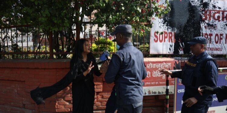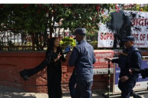 काठमाडौं/घरेलु हिंसापीडित बिनु यादवले सर्वोच्च अदालत परिसरमा राखिएको बोर्डमा कालो रङ छ्यापेर विरोध गरेकी छन्।