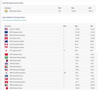 नेपाल राष्ट्र बैंकले आइतबारका लागि विदेशी मुद्राको विनिमय दर तोकेको छ । जस अनुसार भारतीय रुपैयाँ एक सयको खरिद दर १६० रुपैयाँ रहेको छ भने बिक्री दर १६० रुपैयाँ १५ पैसा रहेको छ ।