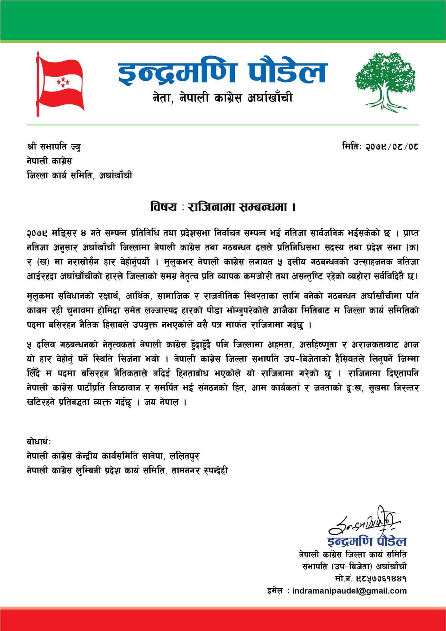 मुलुकमा संविधानको रक्षार्थ, आर्थिक, सामाजिक र राजनीतिक स्थिरताका लागि बनेको गठबन्धन अर्घाखाँचीमा पनि कायम रही चुनावमा होमिदा समेत लज्जास्पद हारको पीडा भोग्नुपरेकोले आजैका मितिबाट म जिल्ला कार्य समितिको पदमा बसिरहन नैतिक हिसाबले उपयुक्त नभएकोले यसै पत्र मार्फत राजिनामा गर्दछु ।
