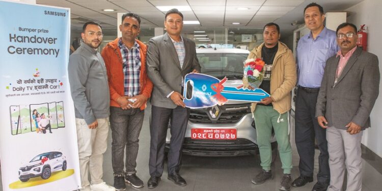 सामसुङ मोबाइलको दशैँ विशेष ‘यो वर्षको दशैँ उपहार डेल्ली टीभी, दामी कार’ अफरमा एकजना भाग्यशाली ग्राहक ‘रेनल्ट क्वीड’ जितेका छन् । गत अगस्टको २८ गतेदेखि सेप्टेम्बर ३० सम्म चलेको अफरमा २६ जना ग्राहकले एक–एक वटा ६५ इन्चको सामसङ टि भी पाएका छन् भने एक भाग्यशाली विजेताले बम्पर पुरस्कारमा रेनल्ट क्वीड जितेको कम्पनीले जनाएको छ । हालैमात्र एक कार्यक्रमकाबीच कम्पनीले विजेताहरूलाई पुरस्कार वितरण गरेको छ ।