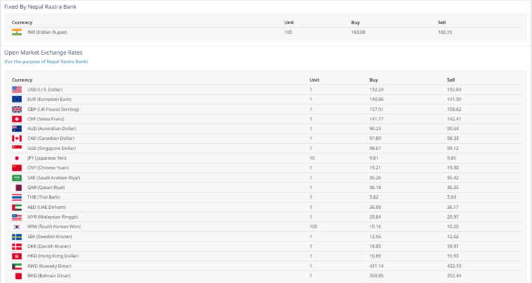 आज डलरको खरिद दर १३२ रुपैयाँ २४ पैसा र बिक्री दर १३२ रुपैयाँ ८४ पैसा रहेको छ। युरो एकको खरिद दर १४० रुपैयाँ ६६ पैसा र बिक्री दर १४१ रुपैयाँ ३० पैसा रहेको छ।