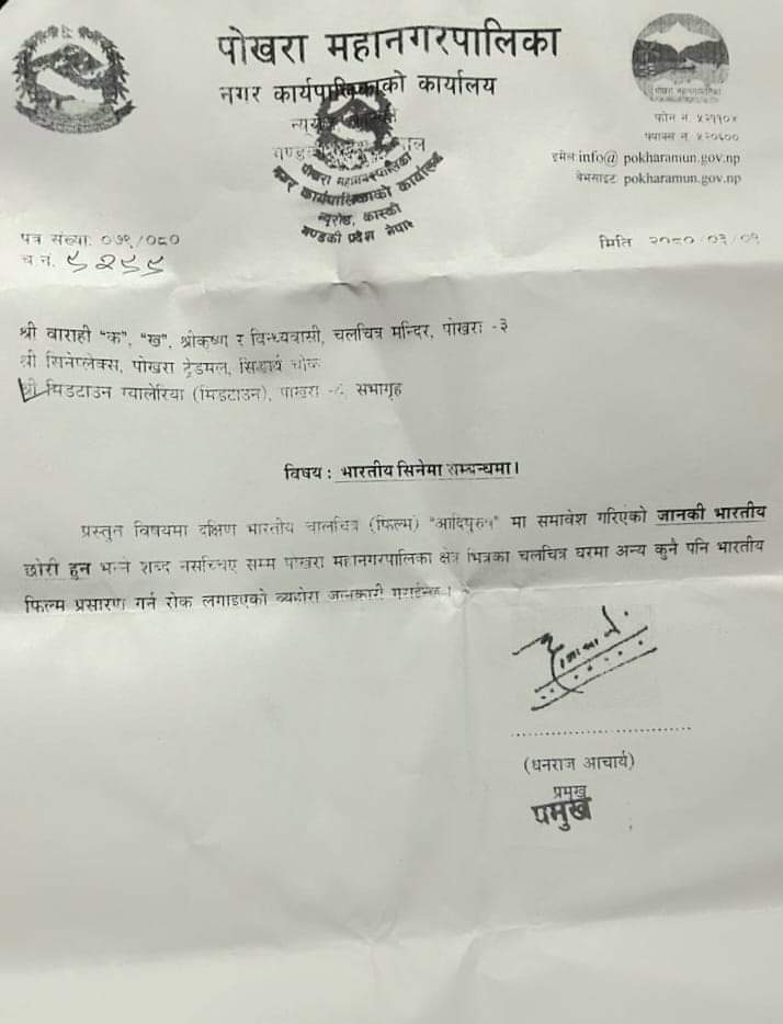 पोखरा महानगरपालिकाका मेयर धनराज आचार्यले महानगरभित्र रहेका सिनेमा हलहरूलाई पत्राचार गर्दै दक्षिण भारतीय चलचित्र ‘आदिपुरूष’मा राखिएको संवाद नसच्याइएसम्म कुनैपनि भारतीय चलचित्र नचलाउन निर्देशन दिएका हुन्।