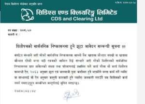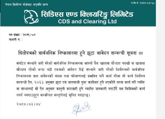 ‘संगठित संस्थाले जारी गरेको सार्वजनिक निष्कासनमा आफ्नो बैंक खातामा मौज्दात नराखी वा खातामा मौज्दात रहेको भन्दा बढी रकमको आवेदन दिई संस्थाले जारी गरेको धितोपत्रको सार्वजनिक निष्कासनमा प्राप्त आवेदनको संख्या तथा परिमाणलाई प्रभावित पार्ने कार्य गरेमा सो कार्य धितोपत्र सम्बन्धी ऐन, २०६३ अनुसार झुटा एवम् जालसाजी युक्त कारोबार हुन्छ,’ सीडीएस एण्ड क्लियरिङ लिमिटेडले जारी गरेको सूचनामा भनिएको छ, ‘यस्ता कार्य गर्ने व्यक्ति वा संस्थालाई धितोपत्र सम्बन्धी ऐन अनुसार कानुनी कारवाही हुने व्यहोरा जानकारी गराउँदै यस किसिमको कार्य नगर्न नगराउनुहुन सम्बन्धित सम्पूर्णलाई सूचित गराइन्छ ।’