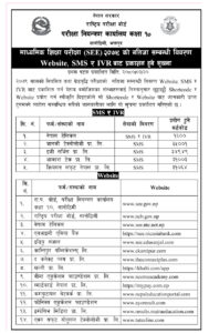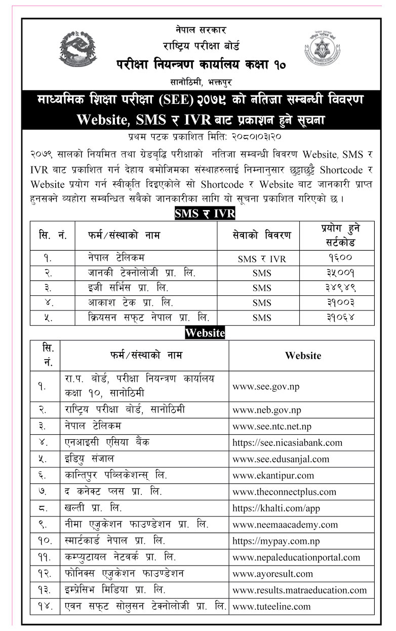 एसईईको नतिजा वेबसाइट, एसएमएस र आईभीआरबाट हेर्न सकिनेछ । परीक्षा नियन्त्रण कार्यालयले नतिजा प्रकाशनका लागि १९ संस्थाले अनुमति पाएका छन । जसमा १४ वटामा वेबसाइटबाट हेर्न सकिनेछ भने ५ वटाबाट एसएमएस र आईभीआरबाट हेर्न सकिनेछ ।
