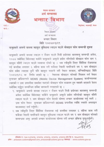 काठमाडौं–३१ बैशाख । भन्सार विभागले मन्त्रिपरिषद् बाट निर्णित विदेश बाट आउदा ल्याउन पाउने मोबाईल फोन सम्बन्धमा थप ब्याख्या गरेको छ ... -